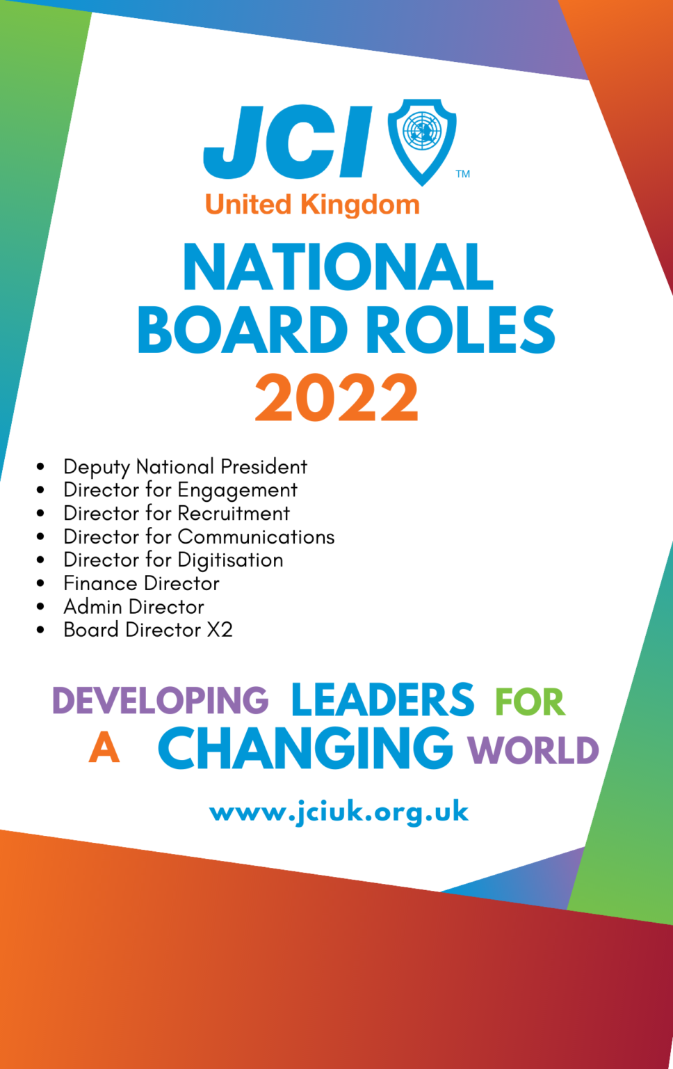 If you are interested in standing please send a completed Intention to Stand Template for 2021 roles to the 2021 JCI UK Admin Director Lucy Collins at lucy.collins@jciuk.org.uk and also to Hope Chirengwa, at hope.chirengwa@jciuk.org.uk before the deadline of 1159pm on Saturday 14th August 2021.